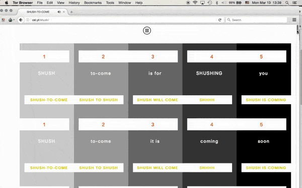 SHUSH wird unsere Denkapparate und Megastrukturen neu formatieren; unsere Systeme refaktorieren. SHUSH fordert ein Ende dieser Welt sodass die nächste eingeführt werden kann. Doch nun, zwischenzeitlich, verharrt dieser Wandel noch am Horizont, ist ständig im Anmarsch, erreicht uns aber nie; kristallisiert sich als permanent kommend. So wird SHUSH zurück gelassen obwohl es immer später und später wird für den geplanten Zeitpunkt. Was ist los mit SHUSH?